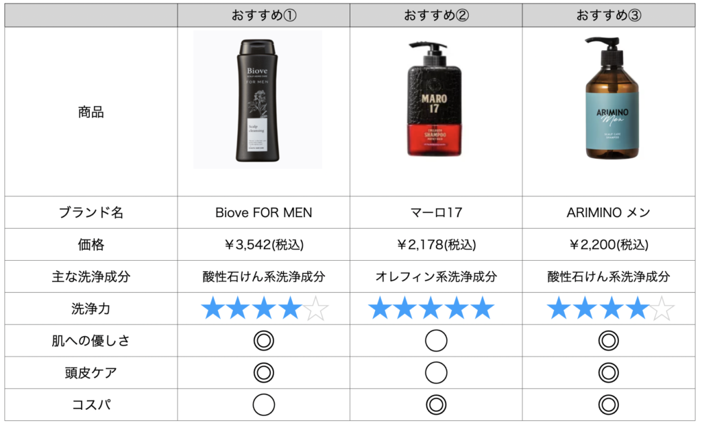 まずはおすすめのスカルプシャンプー厳選3本を以下の比較表でチェック!